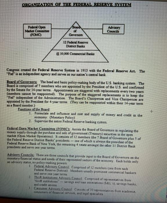12 regional federal reserve banks around 2800 member commercial banks the board of governors of the federal reserve systemthe federal open market committee and the federal advisory council. The governing organization of the Federal Reserve System. Learn vocabulary terms and more with flashcards games and other study tools. Rotates between President of Cleveland and Chicago. One term begins every two years on February 1 of even-numbered years. Rotates between Presidents of KC Minneapolis and SF. The Federal Reserve was created on December 23 1913 when President Woodrow Wilson signed the Federal Reserve Act into law.